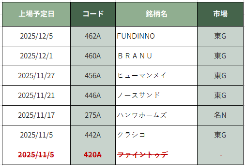 2025年10月 月次新規上場申請承認銘柄数 6社 投稿日 2025年11月4日 著者 北本裕美 カテゴリー IPO情報 ※ 420A ファイントゥデイHD 新規上場承認取り消し (10月20日 東証発表) 詳細はこちら☞ IPO情報一覧 – ゾイックス株式会社